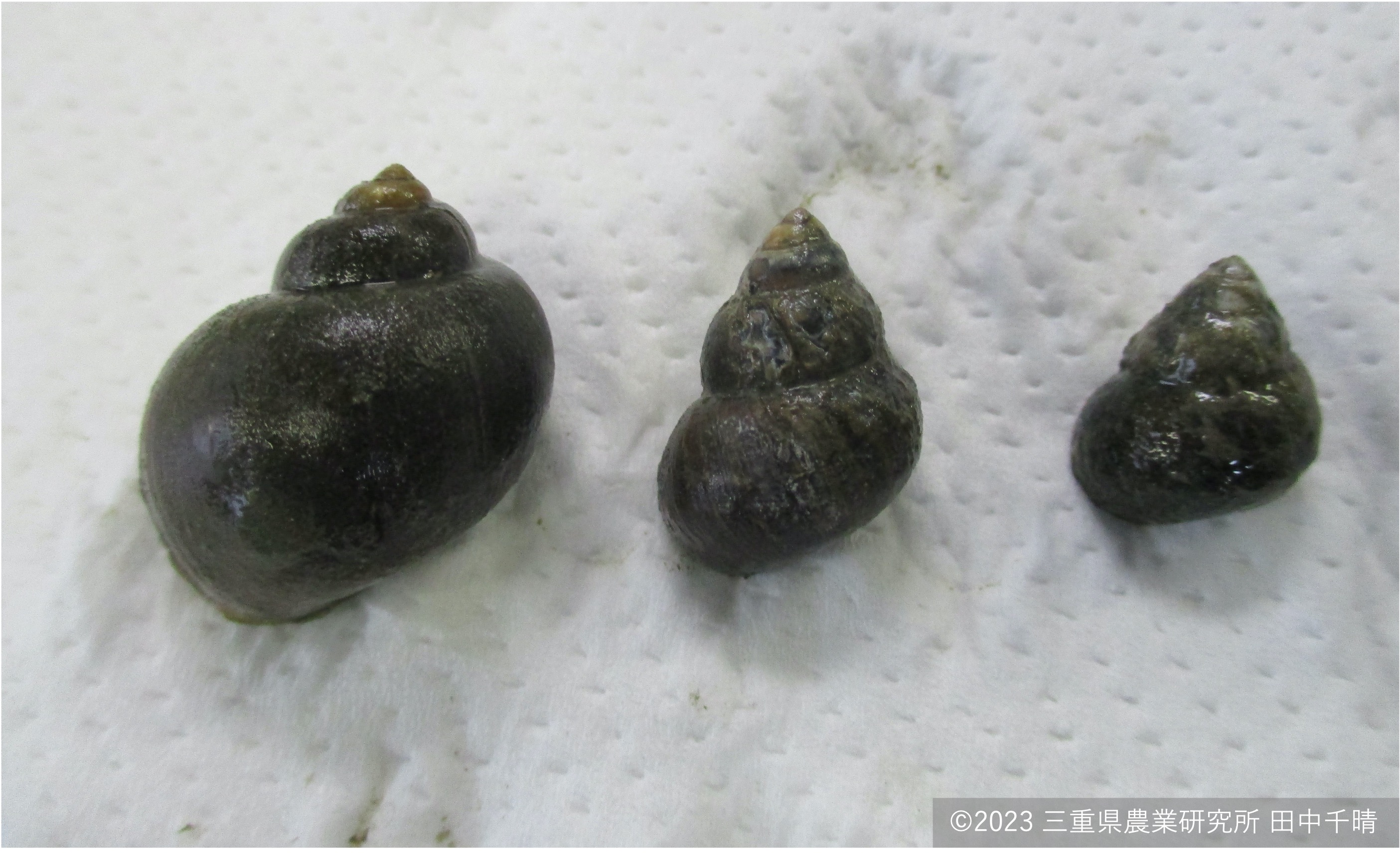 リンゴガイ科の一種である大型の巻貝で、成貝は殻高3~7cm程度です。殻口は大きく、角質のふたを有します。殻の色は黄褐色~黒褐色で、10~15本の縞があります。黒色に近いものもあります。在来タニシ類と比較して、螺塔(螺旋の上部)が小さく、肩をすくめているような見た目からスクミリンゴガイと命名されたとも言われています(諸説あります)。殻径と殻高の長さがほぼ同じという点で、在来のタニシ類との区別が可能です。