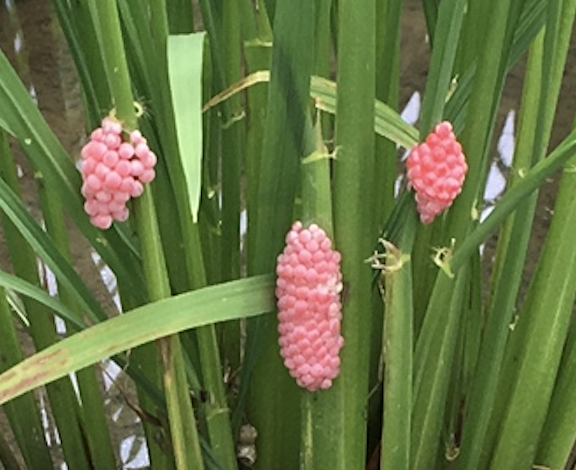 色は濃いピンク色でよく目立つ。200~300 個程度の卵からなる卵塊を形成し、卵塊の大きさは長さ 3cm、幅 1.5cm 程度が多い。ふ化直前は黒~白っぽく、ふ化すると白色になる