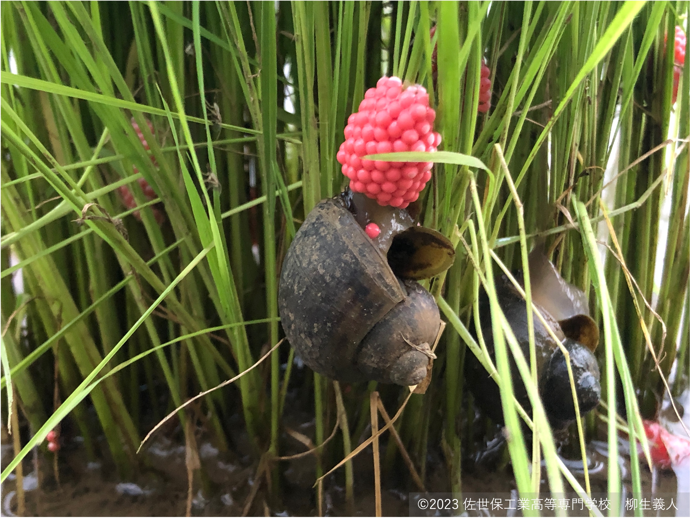 濃いピンク色でよく目立ちます。200~300個程度の卵からなる卵塊を形成し、卵塊の大きさは長さ3cm、幅1.5cm程度のものが多いです。ふ化直前は黒~白っぽく、ふ化すると白色になります 1)。卵塊は、水面よりも上の植物体や水路の壁など、ふ化した稚貝が水中に落下しやすい場所に産み付けられます。卵は水中ではふ化できないため、産卵されたばかりの卵塊は水中に落とすことで駆除が可能です。ただし、ふ化直前の黒~白っぽい卵は水中でもふ化できるため、除去又は押しつぶして破壊する必要があります2)。PV2という神経毒が卵に含まれます3)。この化合物の作用のためか、卵を食べる生き物は、南米原産のヒアリを除いて観察されていません。