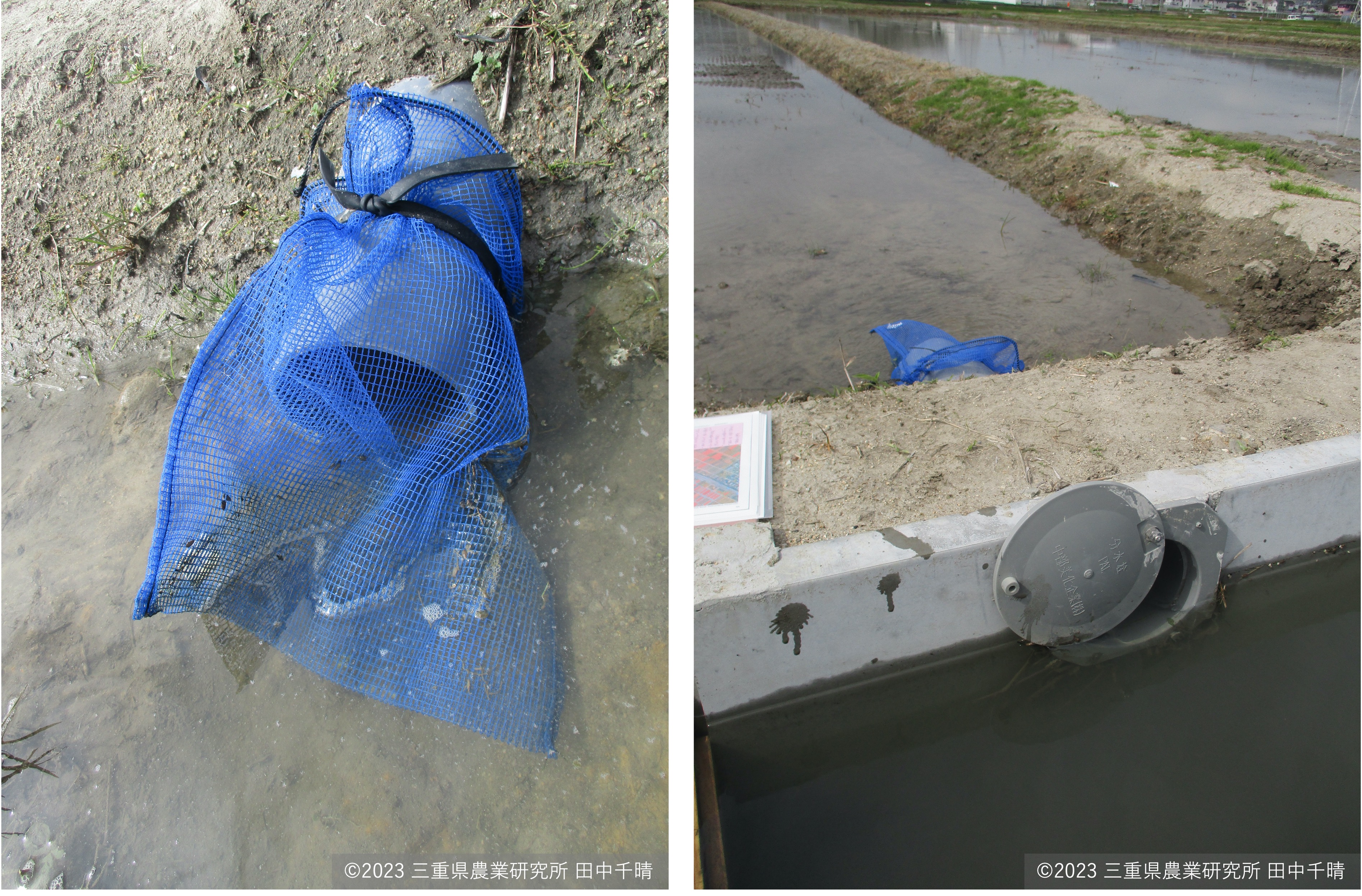 網の目は粗すぎると小さな貝がすり抜け、細かすぎると枯れ草などのゴミですぐ詰まるため、移植水田では9mm目合いが適当です。直播水田ではより小さな貝の侵入も警戒する必要があるため6mm目合い程度が適当です。