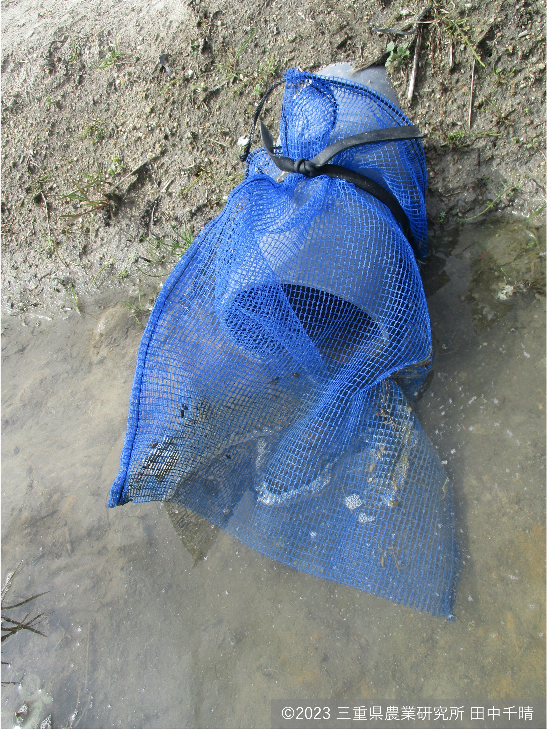網の目は粗すぎると小さな貝がすり抜け、細かすぎると枯れ草などのゴミですぐ詰まるため、移植水田では9mm目合いが適当です。直播水田ではより小さな貝の侵入も警戒する必要があるため6mm目合い程度が適当です1)。
