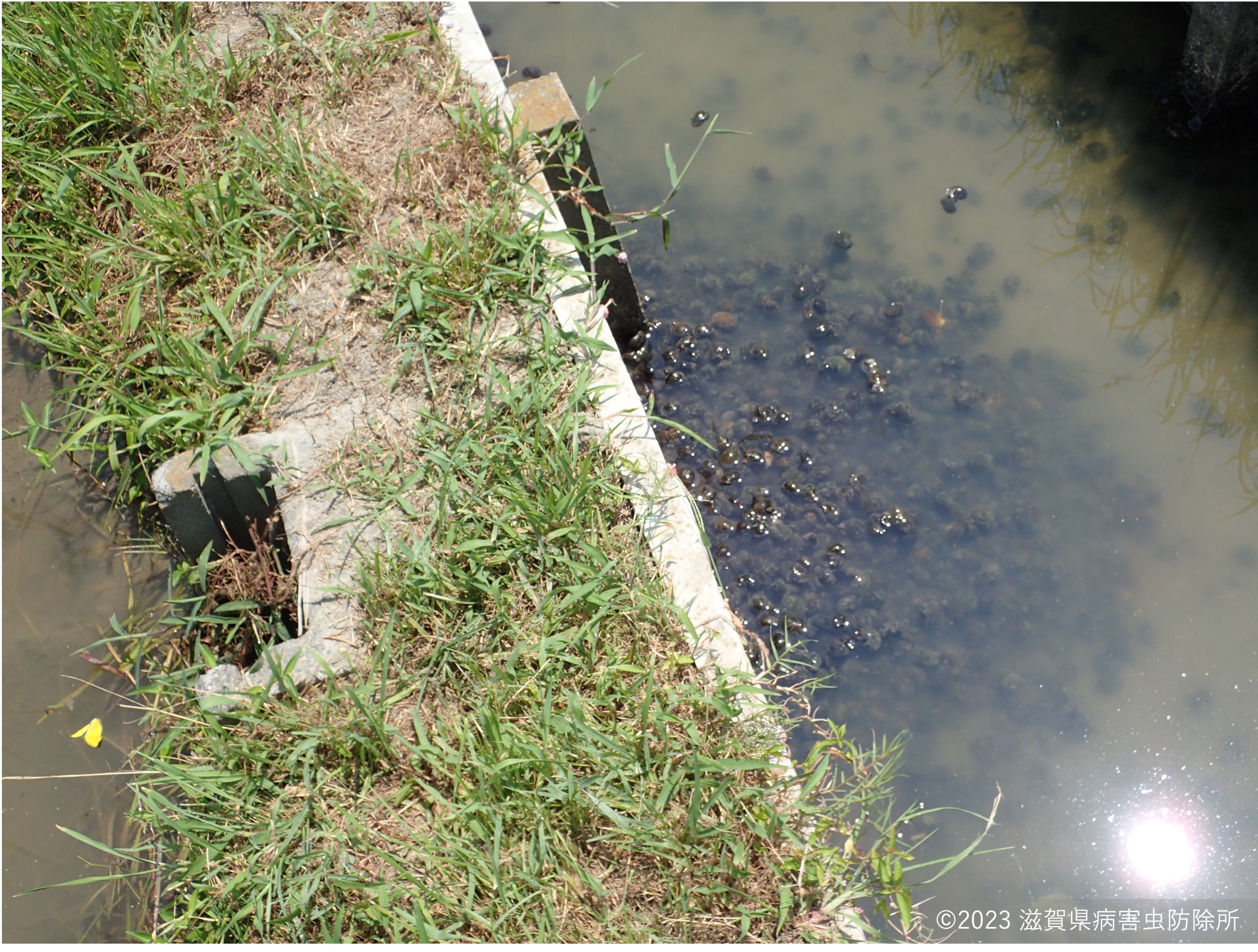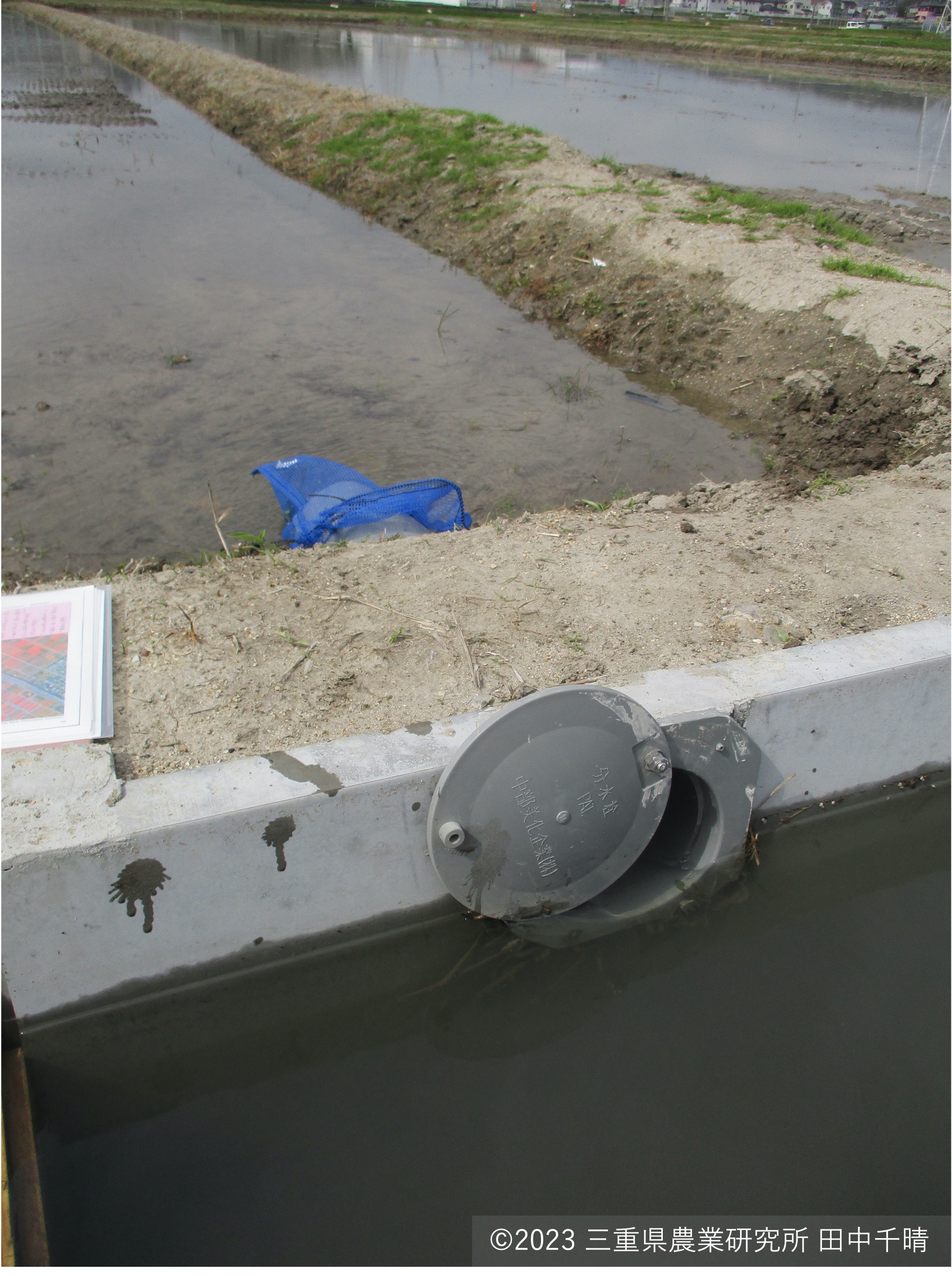 取水口・排水口に9mm目合い程度のネットや金網を設置し、貝を本田に侵入させないようにします。移植前の入水時から水稲が食害されにくくなる5葉期(移植後3週間程度)までの設置が効果的です。ネットの目詰まりは、網をU字状に設置するなどして、ネットの表面積を広く取ると軽減できます。また、ゴミ避けとしては外側(水路側)に2cm目合い程度の網を付けると効果的です。