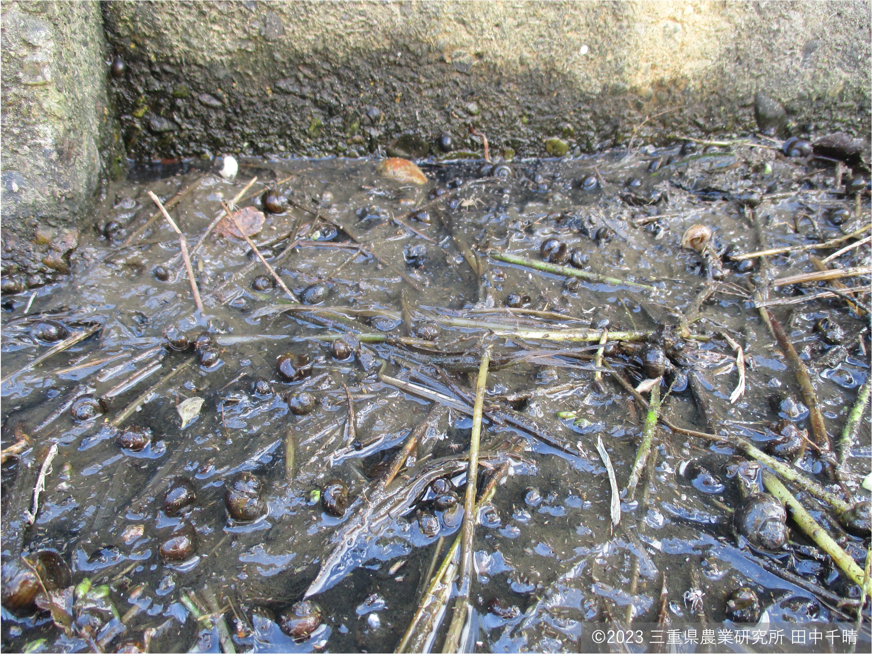 水路で越冬中のスクミリンゴガイ