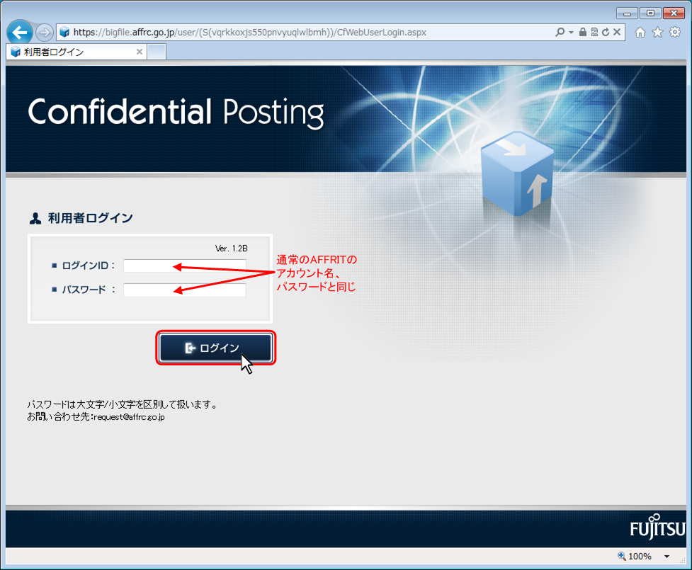 農林水産研究情報総合センター (AFFRIT)では、メールに添付することのできない大容量のファイルを送ることができる「大容量ファイル転送システム」を提供しています。このページでは、大容量ファイル転送システムでファイルを送信する手順を説明しています。