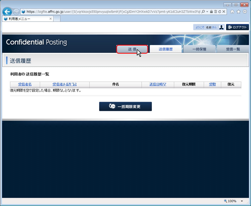 [ログイン]ボタンを押しユーザ認証されると、「送信履歴」画面が表示されます。