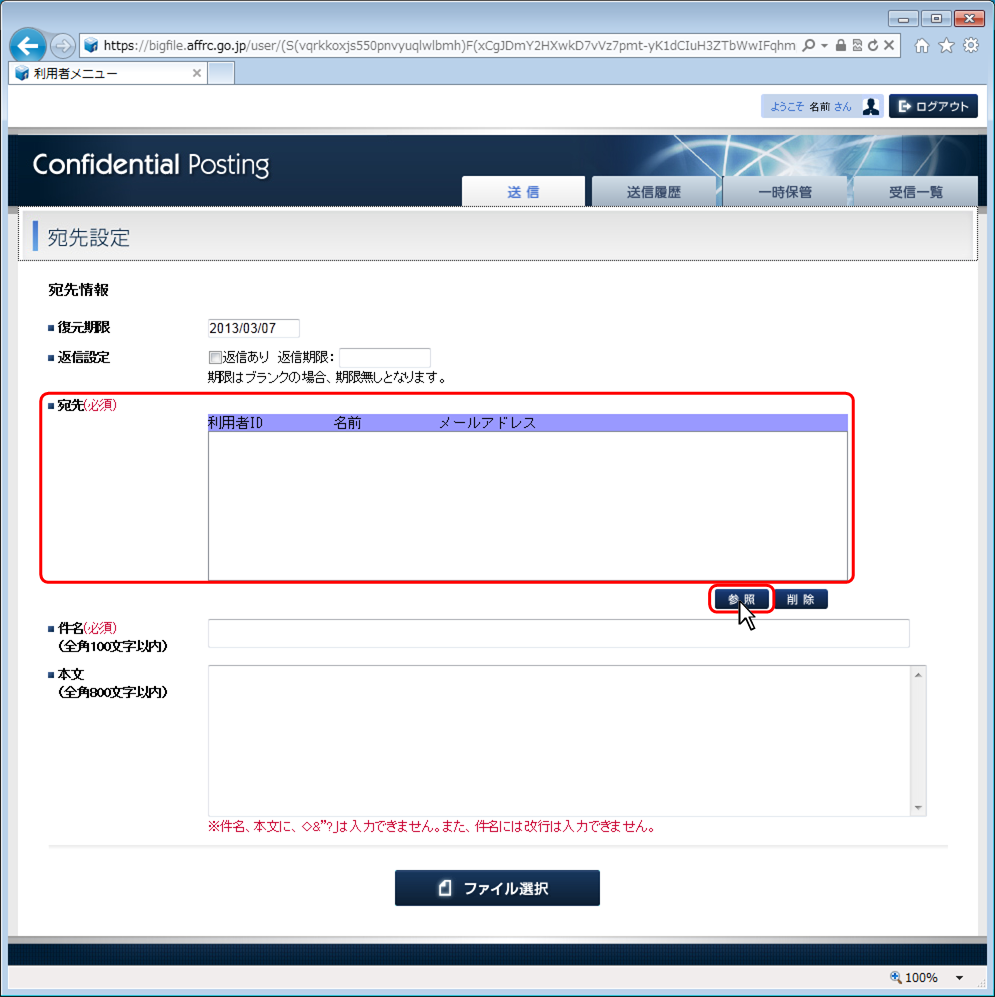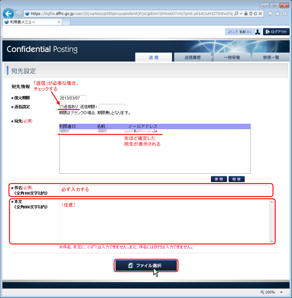 件名(必須)と本文(任意)を入力し、[ファイル選択]ボタンを押すと、「ファイル選択」画面が表示されます。