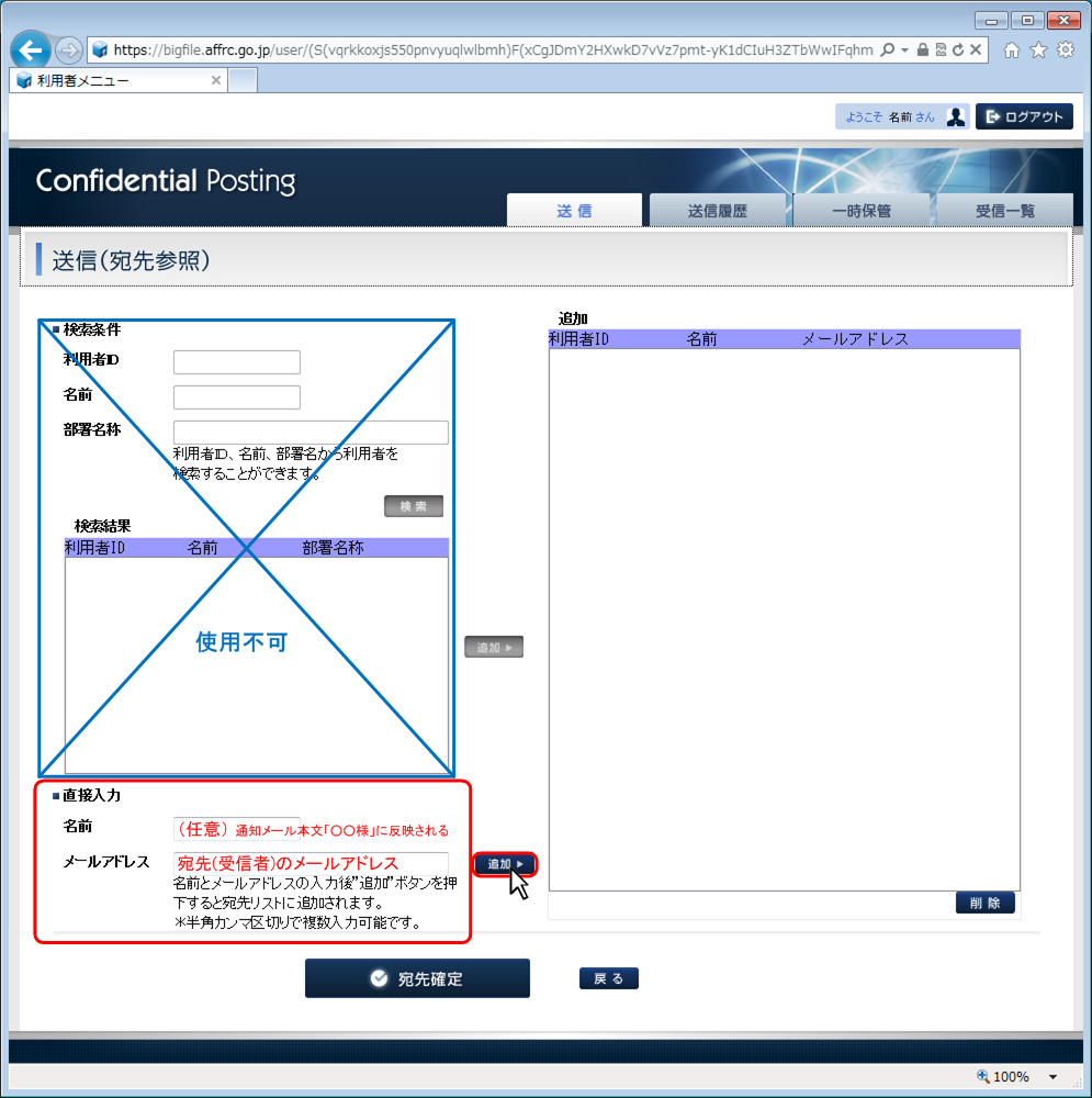 名前(任意)とメールアドレス(必須)を入力し、[追加]ボタンを押すと、画面右に宛先が追加されます。