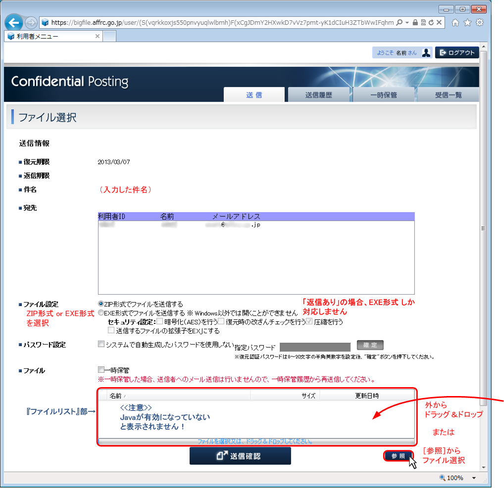 送信を行うためにJavaの実行環境が必要であることを上で説明していますが、受信者がダウンロードする際にもJavaの実行環境が必要です。社内規定等でJavaの実行環境を利用できない方にはファイルを送ることができません。