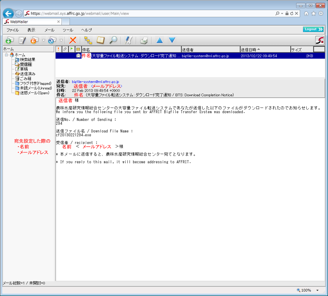 受信者がファイルをダウンロードすると、大容量ファイル転送システム(bigfile-system@ml.affrc.go.jp)から、送信者に対し「ダウンロード完了通知」メールが届きます。