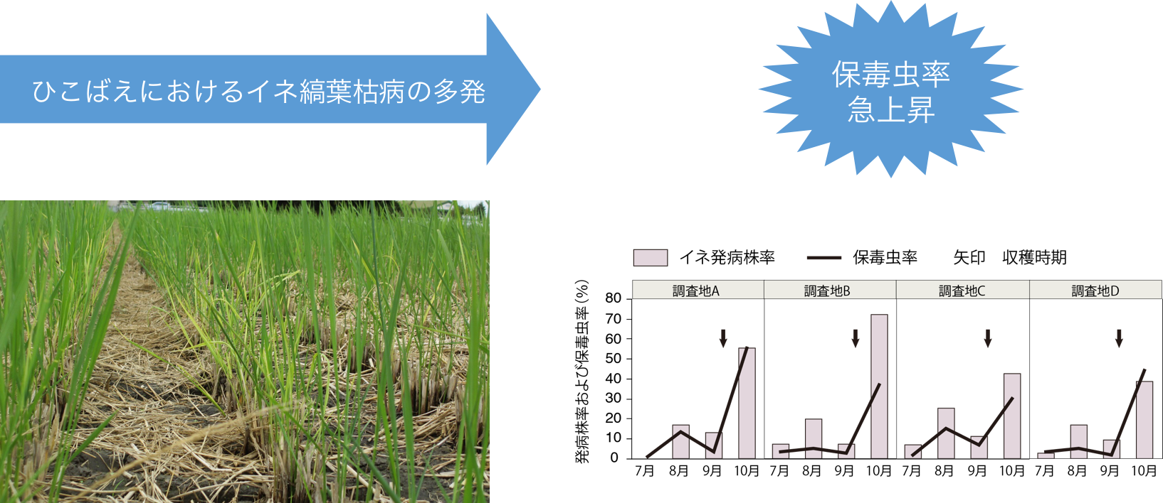 イネ縞葉枯病の多発地域では、イネ収穫後のひこばえにおいてイネ縞葉枯病の発病株率が急激に上昇し、それにともない媒介虫の保毒虫率も急激に上昇する1)。